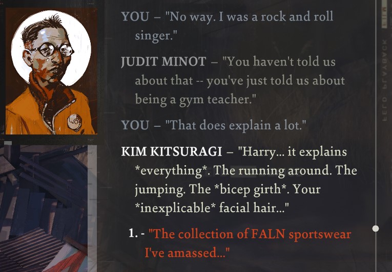 There is something so touching about the story, so raw and powerful. We are a drunk, we are pathetic, we are a shell of something that was great. We’re a man that has been left 6 years ago and yet has not even begun the process of grief. We are oblivion itself, Revachol’s might made manifest. We’re a cop, a detective, and despite not even remembering what money is, we are one of the finest detective there is. I’m pretty sure we have some kind of supernatural ability. Also Kim’s super mega cool. We love Kim. We also love Cuno despite the child being a right bastard at times.